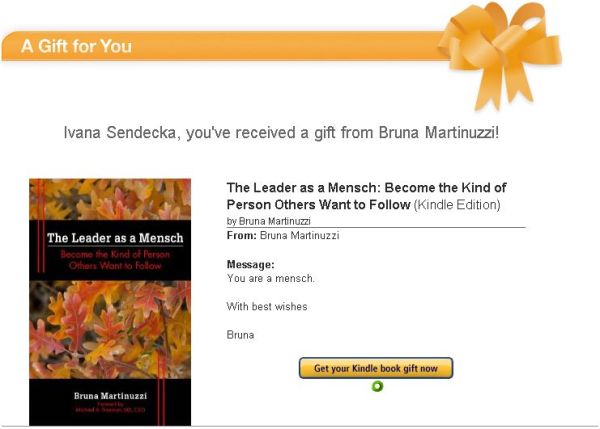 Yes…Bruna sent me Kindle version of her book The Leader As a Mensch. I have been honored to read it cover to cover with total gratitude, that there are people like Bruna walking on our planet...No further comments, just: Thanks to whomever is responsible for such touching moments, people like Bruna and all gifts on my life’s journey. Should you read Bruna’s book? If you want to “become the kind of person others want to follow”, then definitely, yes! 😉