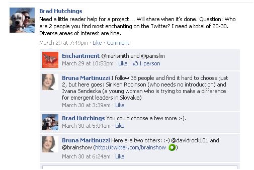 How did I come across this amazing book? It has a story behind -> want to know about it? Read on: Last year in November, I have been mentioned in the blog post on American Express Open Forum : Self-Efficacy: The First Requisite for Success -> I did not have a clue that Bruna Martinuzzi exists nor had I any clue that she knows about “no name” like me. Whoa, I was blown away. But, hold on, that is just a beginning of my relationship 2.0 with this remarkable lady, who is fluent in 6 languages, wrote a book, speaks and coaches world’s finest leaders. Few months back Bruna ‘hits’ me with ‘generosity slap’ on Guy Kawasaki‘s Facebook page Enchantment , again => see how at a picture bellow.